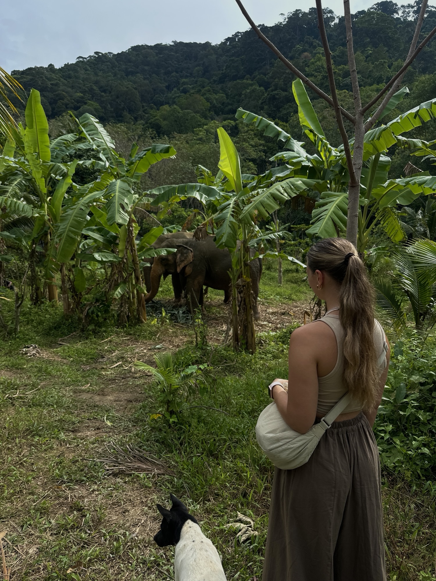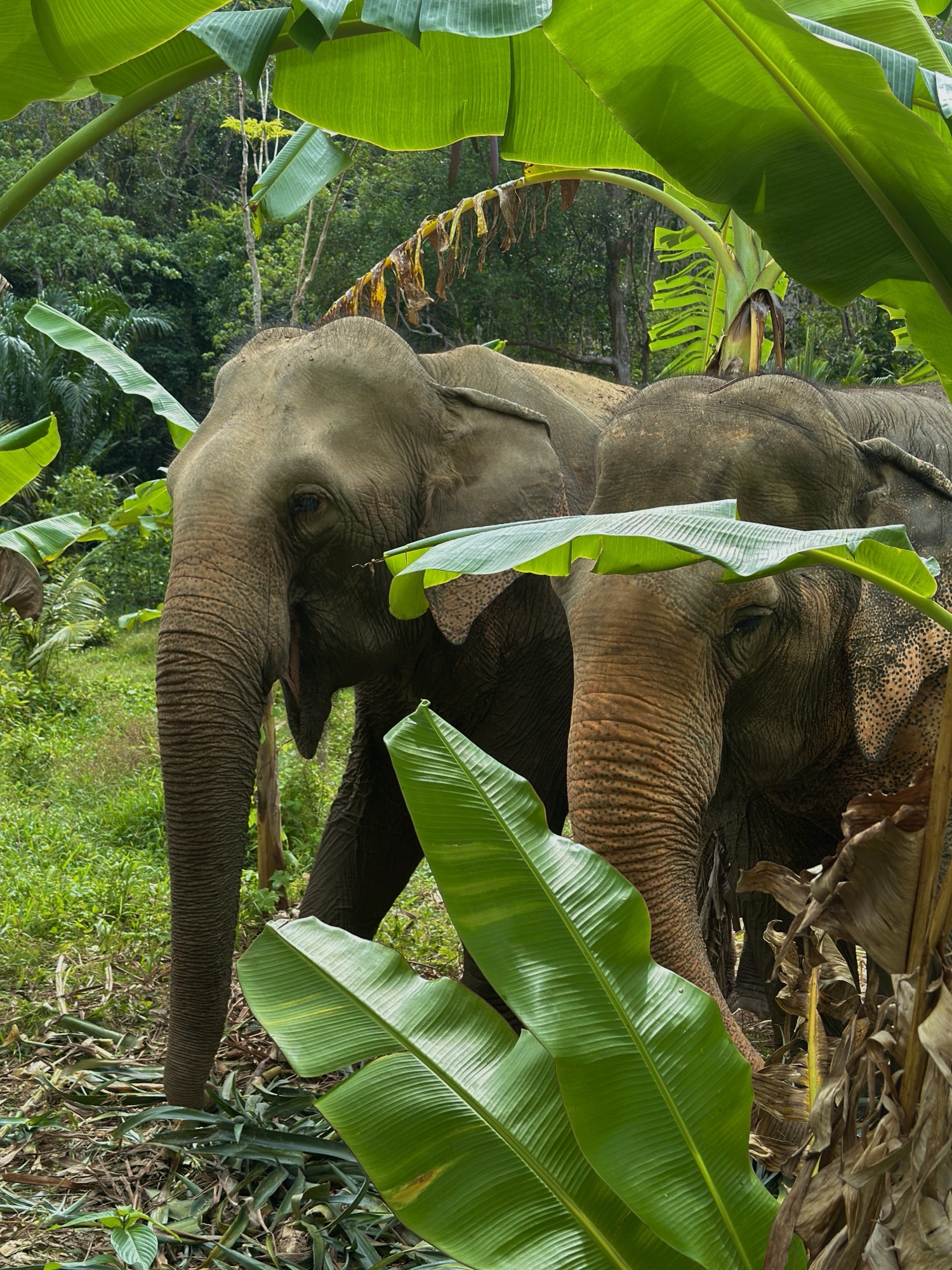 Hier leben die Elefanten in einem geschützten Gebiet und bei dem Besuch handelt es sich eher um eine Walking-Safari. Wir haben uns für die 8 Stunden Tour entschieden. Die ersten Stunden haben wir damit verbracht in einer kleinen Gruppe mit unserem Guide durch den Wald zu laufen und dabei die Elefanten aus sicherer Entfernung (für uns und für die Elefanten) zu beobachten. Da die Guides auch nicht wissen, wo sich die Elefanten genau befinden, mussten wir weit laufen und auch teilweise steile Hänge hinaufsteigen. Jedoch haben wir alle Elefanten der Sanctuary gesucht und letztendlich auch gefunden.