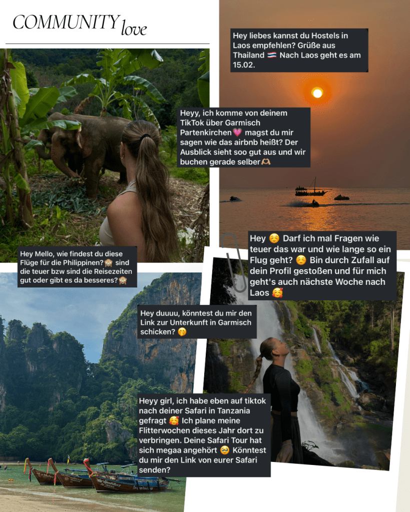 Der Austausch mit meiner Community liegt mir besonders am Herzen. Ich bekomme täglich Fragen zu Unterkünften, Buchungsdetails oder meinen Travel Gadgets und nehme mir bewusst Zeit, diese ehrlich und transparent zu beantworten. Genau dieses Vertrauen ist die Basis meiner Arbeit.